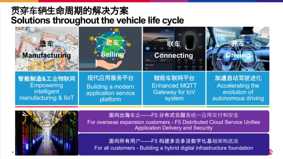 从“造车、卖车、联车、到开车”,F5贯穿整个汽车生命周期,提供了一整套全面的解决方案。从智能化的工厂到数字化的销售平台,从车联网的安全保障到自动驾驶的AI加速,F5不仅帮助车企提升了生产效率,优化了用户体验,还通过强大的云计算能力和智能安全保护,为车企的全球业务布局提供了强有力的支持。