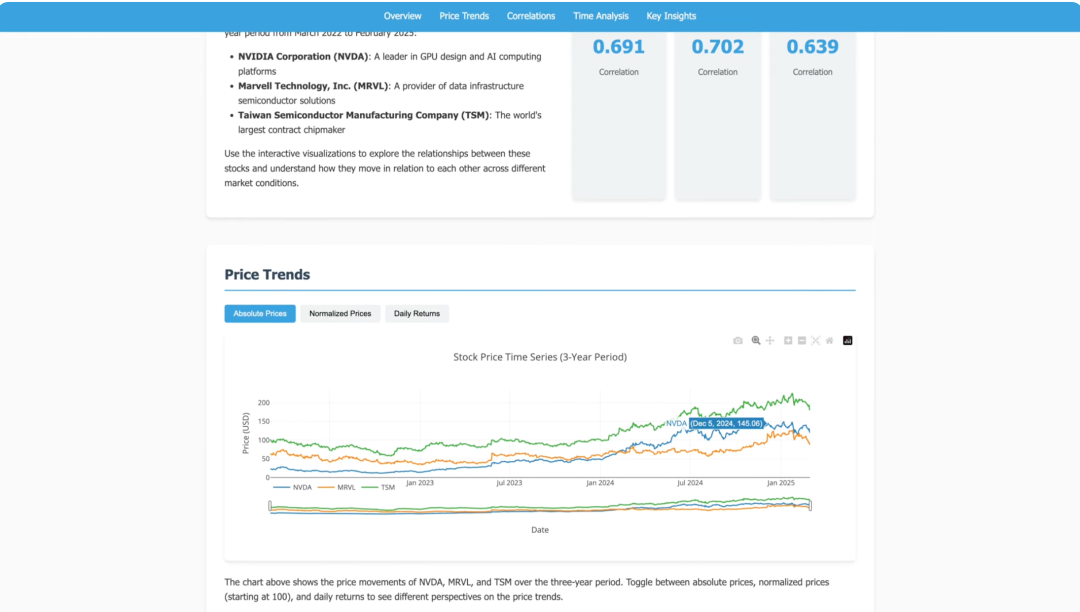 案例给出的任务是分析过去三年中英伟达、迈威尔科技和台积电股票价格之间的相关性:众所周知这三支股票之间存在紧密的关联性,但对于新手用户来讲,很难快速将其中的因果关系整理清楚。