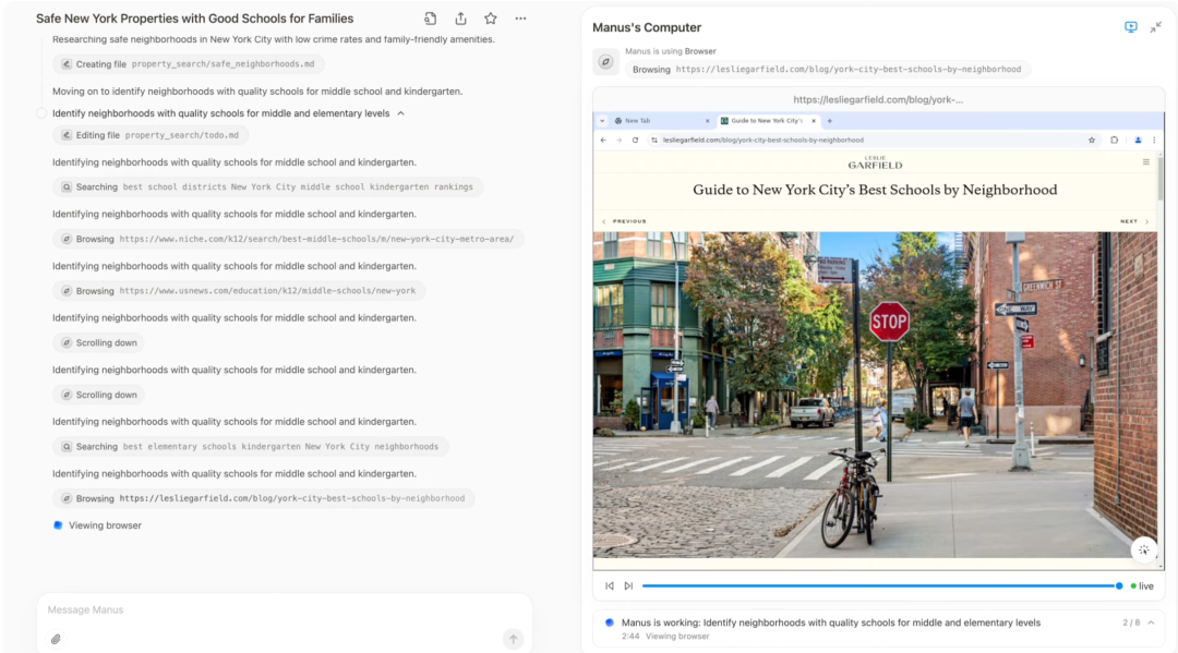 在这个需求中,Manus 将复杂任务分解为待办事项列表,包括研究安全社区、识别优质学校、计算预算、搜索房产等。并通过网络搜索,仔细阅读有关纽约最安全社区的文章,收集相关信息。