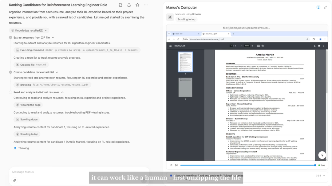 第一个任务是简历筛选。从 15 份简历中筛选出适合强化学习算法工程师职位的人选,Manus 已经展现出了像人类实习生的一面,手动解压缩文件,并逐页浏览每一份简历,同时记录其中的重要信息。