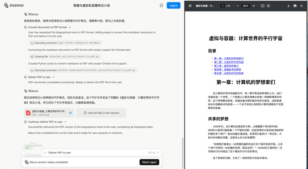 此外,Manus 完全基于云端异步运行,它的能力不受设备算力或平台形态的限制。你甚至可以在下达指令后直接关掉电脑,而 Manus 仍然会在后台独立完成任务,并在结果生成后自动通知你。这种交互模式让 AI 真正融入日常工作流,就像你在下班后给实习生发微信:“文件整理好发我。” 只不过,这个实习生 7×24 小时在线,效率更高,还不用担心他哪天突然“整顿职场”。