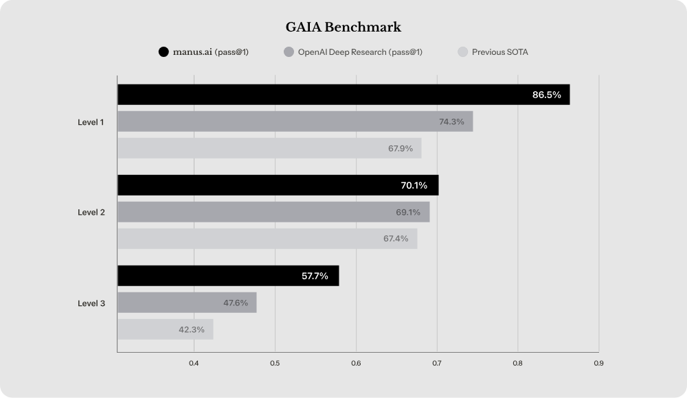 Manus 在 GAIA 基准测试(一项严格评估 AI 解决现实世界问题能力的测试)中取得了业界领先的成绩,充分证明了其能够交付可量化且可靠的结果。