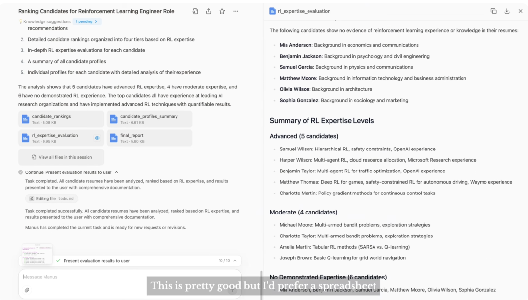 在 Manus 提供的结果中,不仅包含自动生成的排名建议,还会基于工作经验等关键维度,将候选人划分为不同等级。当用户表达希望以 Excel 表格形式查看数据时,Manus 还能自动生成并格式化相应的表格,以更直观、便捷的方式呈现筛选结果。