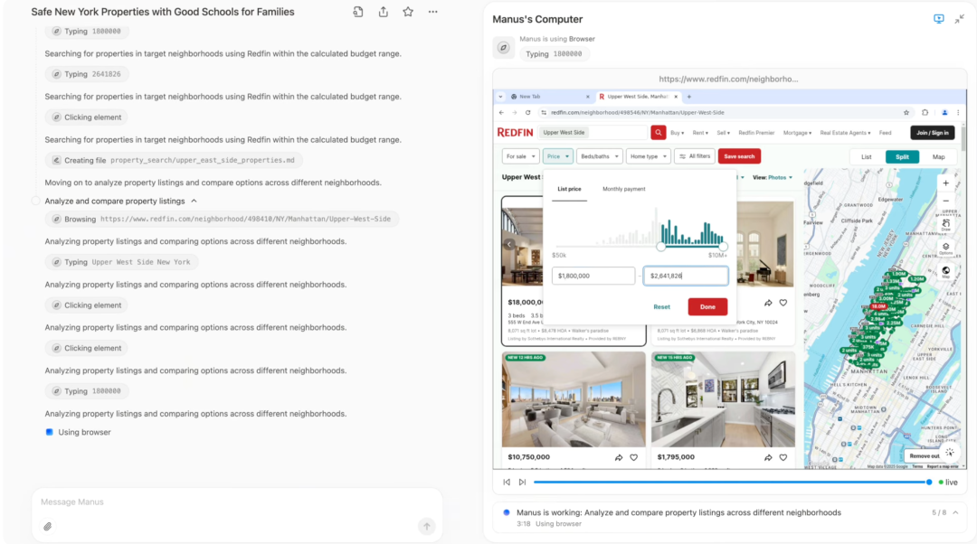Manus 通过编写一个 Python 程序,根据用户收入计算可负担的房产预算。结合房地产网站上相关的房价信息,根据预算范围筛选房产列表。Manus 甚至可以人类一样在网站上输入搜索条件进行搜索。