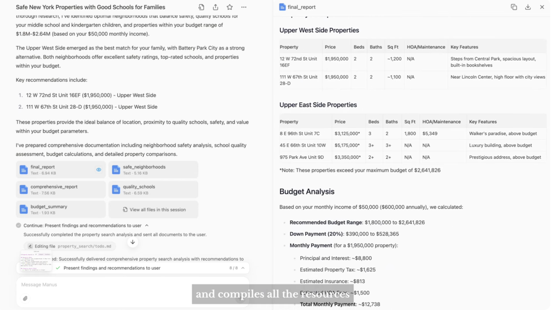 最后,Manus 会整合所有收集的信息,撰写详细报告,包括社区安全分析、学校质量评估、预算分析、推荐房产列表以及相关资源链接——就像一个专业的房地产经纪人一样。