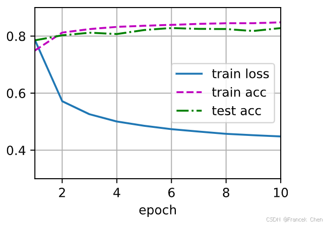 在这里,我们使用学习率为0.1的小批量随机梯度下降作为优化算法。这与我们在线性回归例子中的相同,这说明了优化器的普适性。