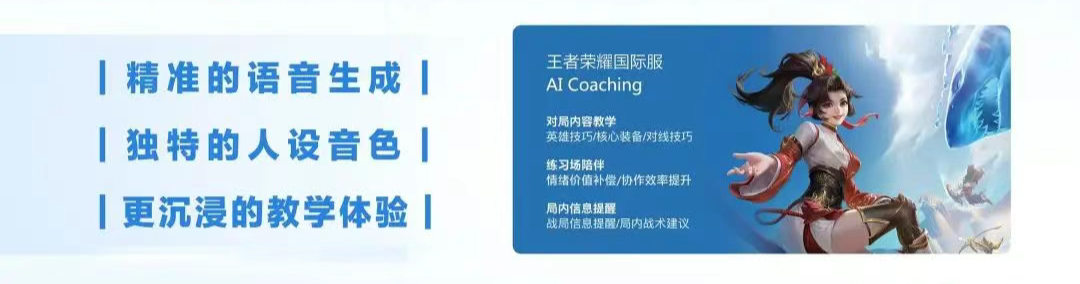 《王者荣耀》的AI Coaching可在训练对决中结合玩家及对局数据精准给出当前所使用英雄的技能与装备教学,并会进行实时对线指导,在逆风局、带线局等各种不同情况下给出不同的游戏策略,甚至预测局势走向,为玩家提供大局观指导,真正做到边玩边学。同时,AI还能够复刻各个英雄的音色,带来更沉浸的教学体验,强大的多语言能力可支持中、英、西、葡、阿、土等多语种,助力游戏全球化运营。