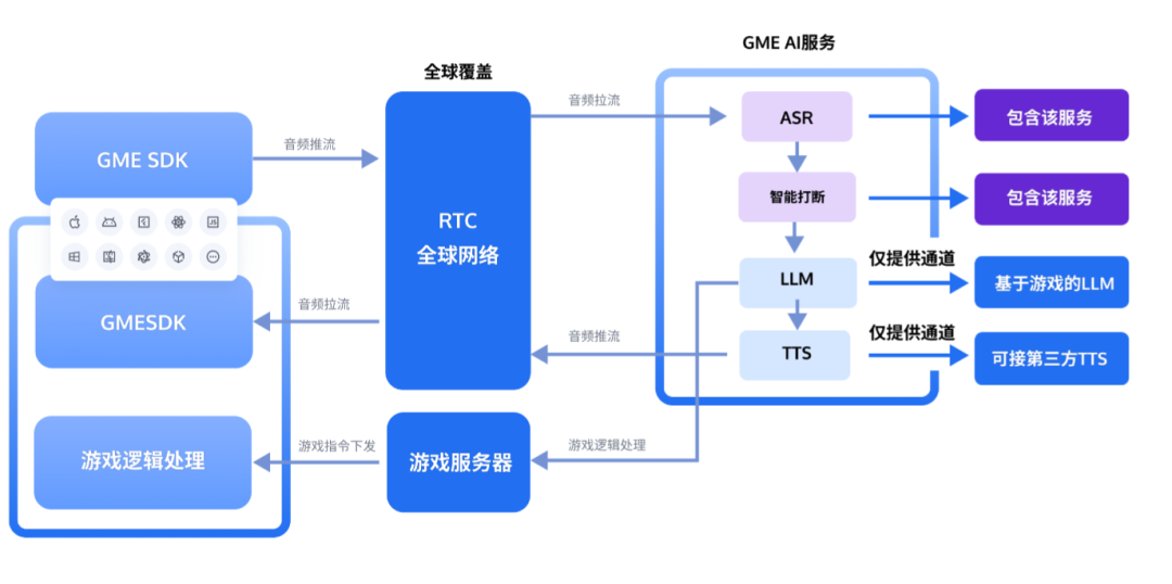 作为行业领先的RTC厂商,腾讯云实时音视频(TRTC)此前已依托腾讯海量游戏开发运营经验,基于真实游戏场景专门优化推出了一站式游戏语音解决方案——游戏多媒体引擎(GME)。随着AI能力的快速突破,以及腾讯内部在游戏AI方向上的超前探索,腾讯云TRTC进一步将GME与AI实时通话能力整合,为游戏行业用户搭建出性能最优、延时最低的对接通道,在内嵌腾讯云ASR的同时,整合业内领先的LLM/TTS方案进行深度优化,将AI对话总延迟低至1000ms,媲美人类对话反应速度,并融入声纹识别、语义断句、背景音、承接语等创新能力,使对话效果更自然、拟真。