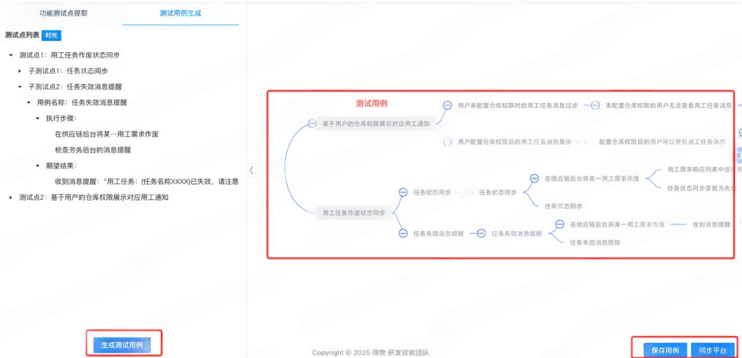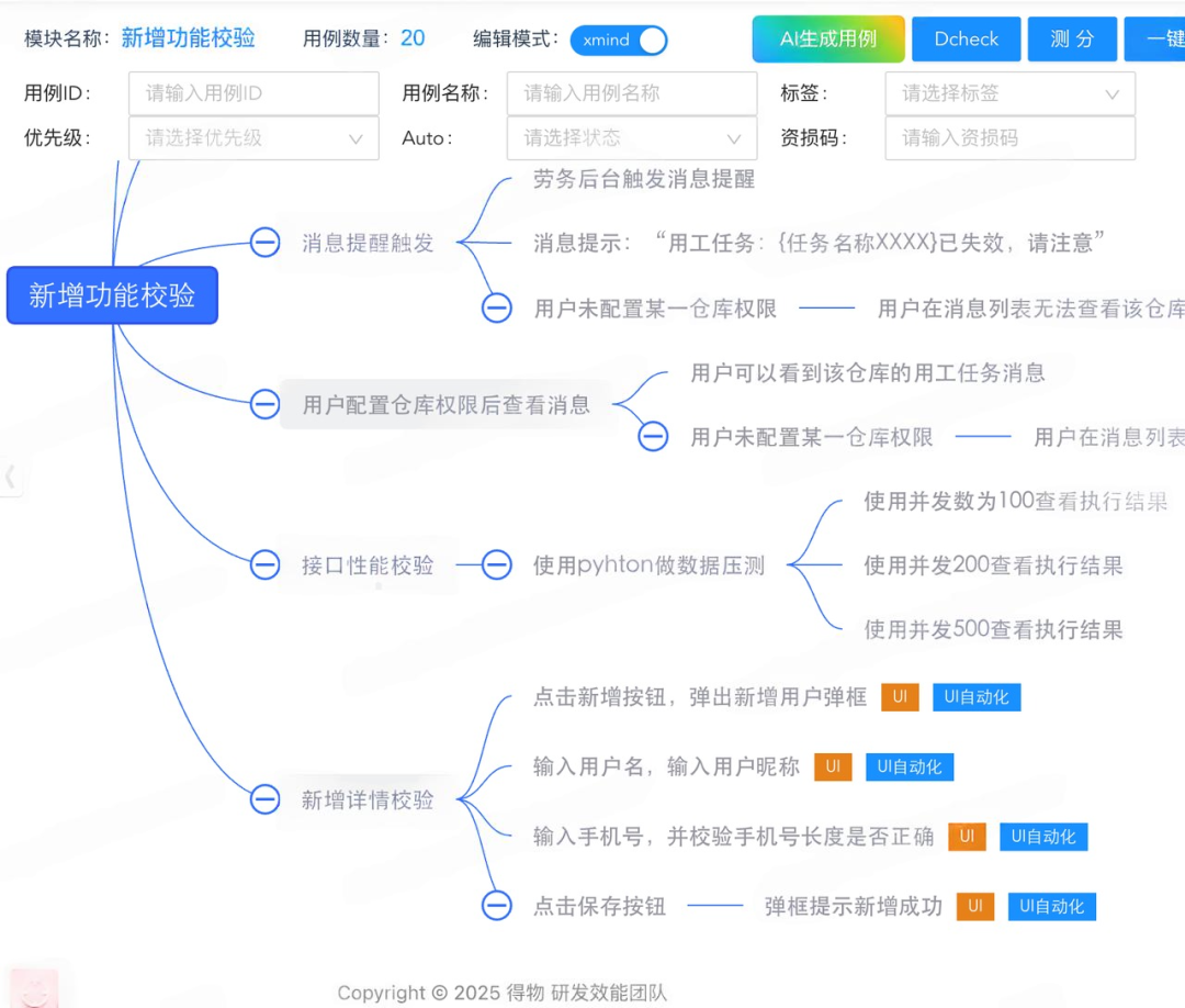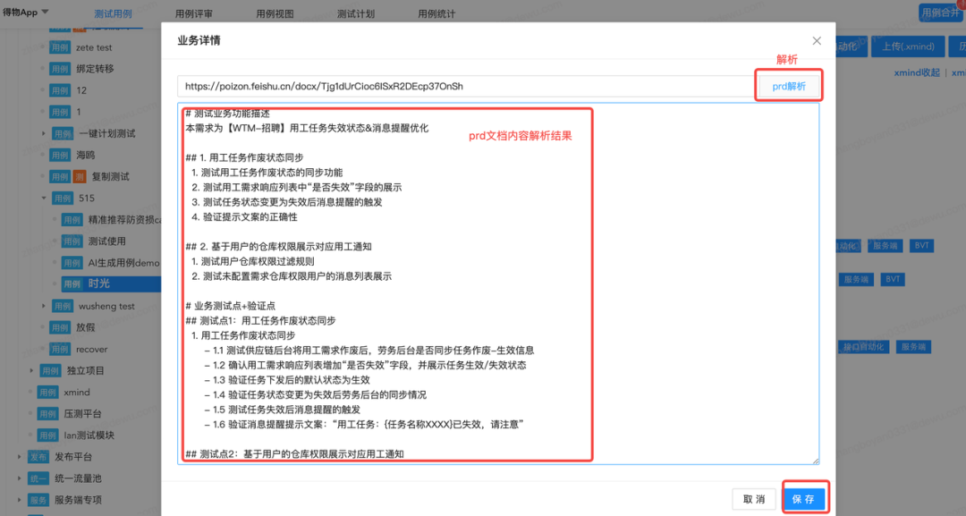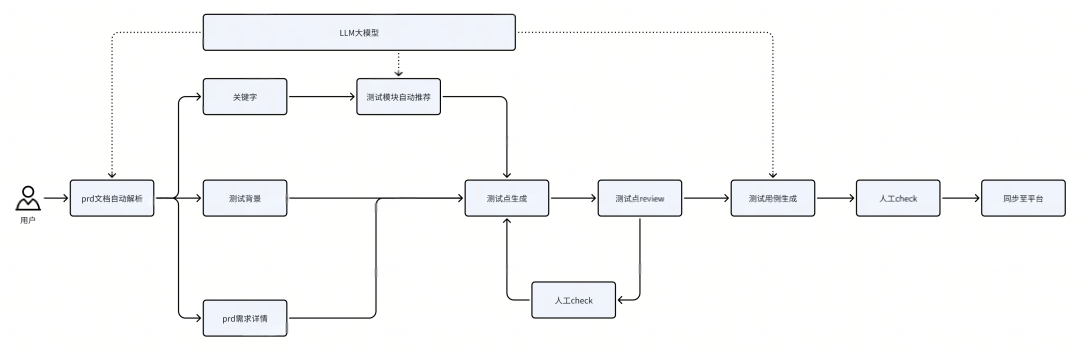目前平台侧已经实现自动生成功能用例的功能,实现了从 PRD自动解析->测试点生成-> Xmind用例生成->同步平台的完整流程。可以一定程度上提升用户编写用例效率。