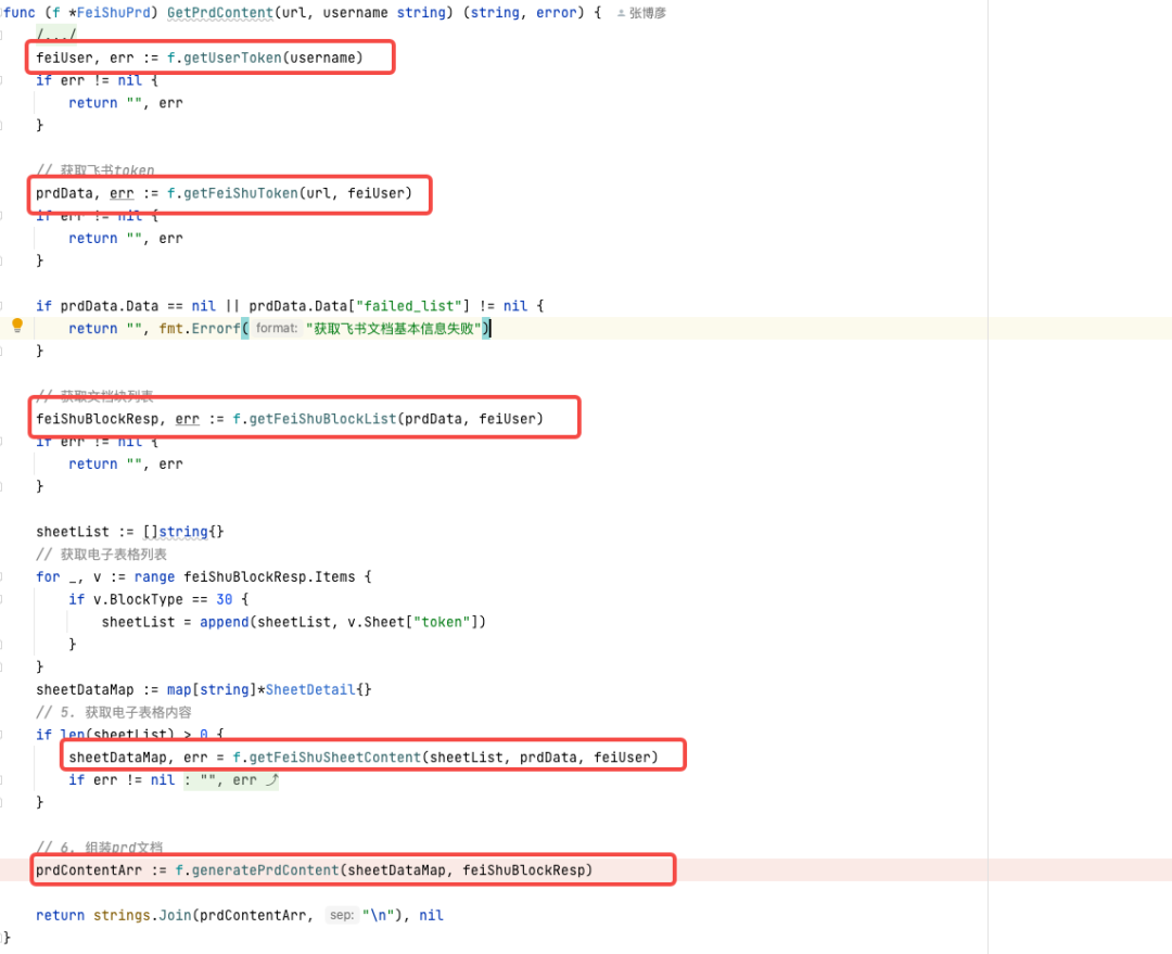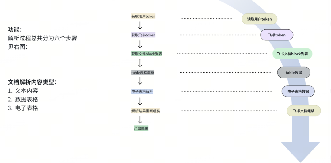 平台支持飞书PRD文档中文本、多维表格、电子表格内容的解析,暂不支持对图片、流程图解析。文档读取分为6个步骤,分别为:获取飞书token、获取用户token、获取文件block列表、Table表格解析、电子表格解析、解析结果组装。以下主要介绍解析部分内容: