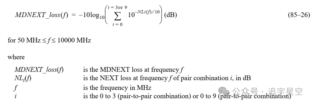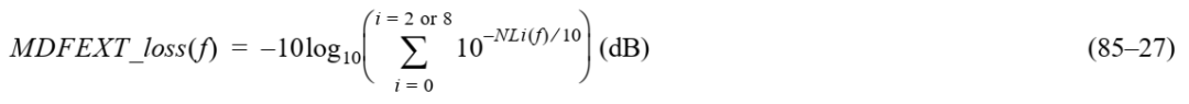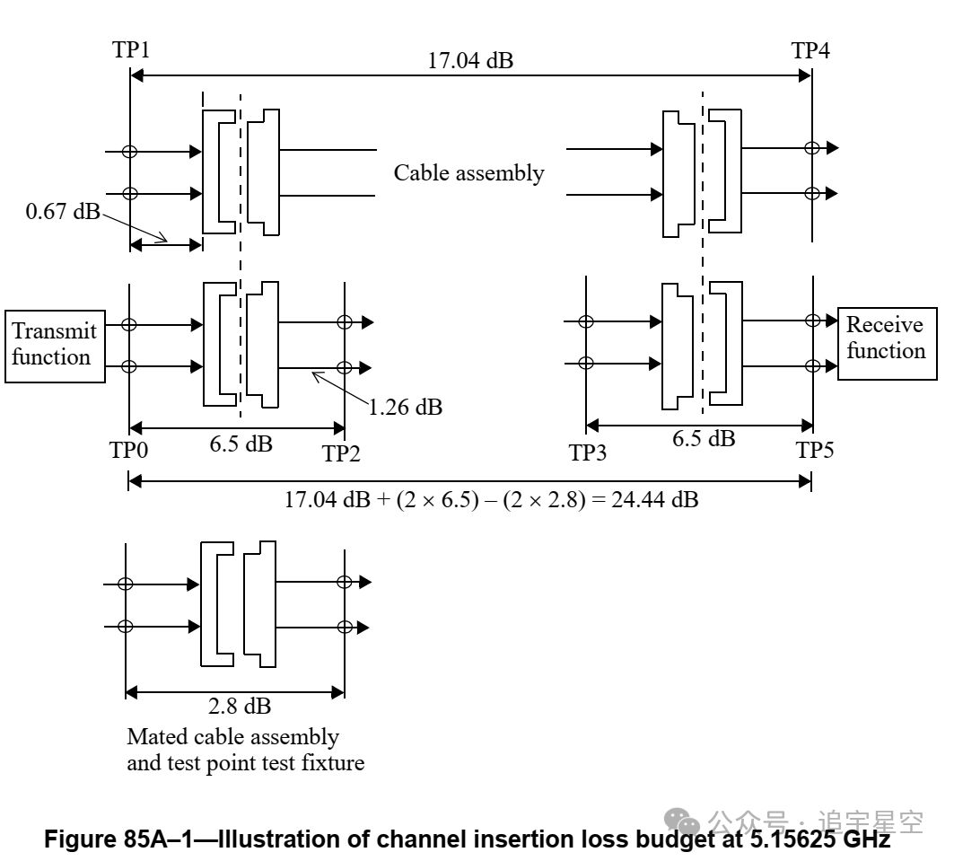 40GBASE-CR4和100GBASE-CR10通道在TP0和TP5之间定义,包括发射机和接收机差分控制阻抗印刷电路板以及电缆组件。图85A-1详细提供了每个差分通道的信道参数插入损耗、插入损耗偏差(ILD)、插入损耗与串扰比以及发射机和接收机差分控制阻抗印刷电路板。提供了长度为0.5m至7m的预期拓扑的信道插入损耗信息。5.15625 GHz的信道插入损耗预算如图85A-1所示。