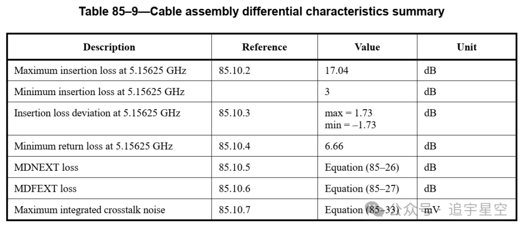 40GBASE-CR4和100GBASE-CR10电缆组件包含端接在每端连接器中的绝缘导体,用作MDI之间的链路段。该电缆组件主要用作使用可控阻抗电缆的网络端口之间长达7米的点对点接口。所有电缆组件测量应在TP1和TP4之间进行,使用规定的电缆组件测试夹具。这些电缆组件规格基于双轴电缆特性,其他电缆类型也是可以接受的。表85-9总结了5.15625 GHz下的电缆组件差分特性,并参考了解决每个参数的子条款。