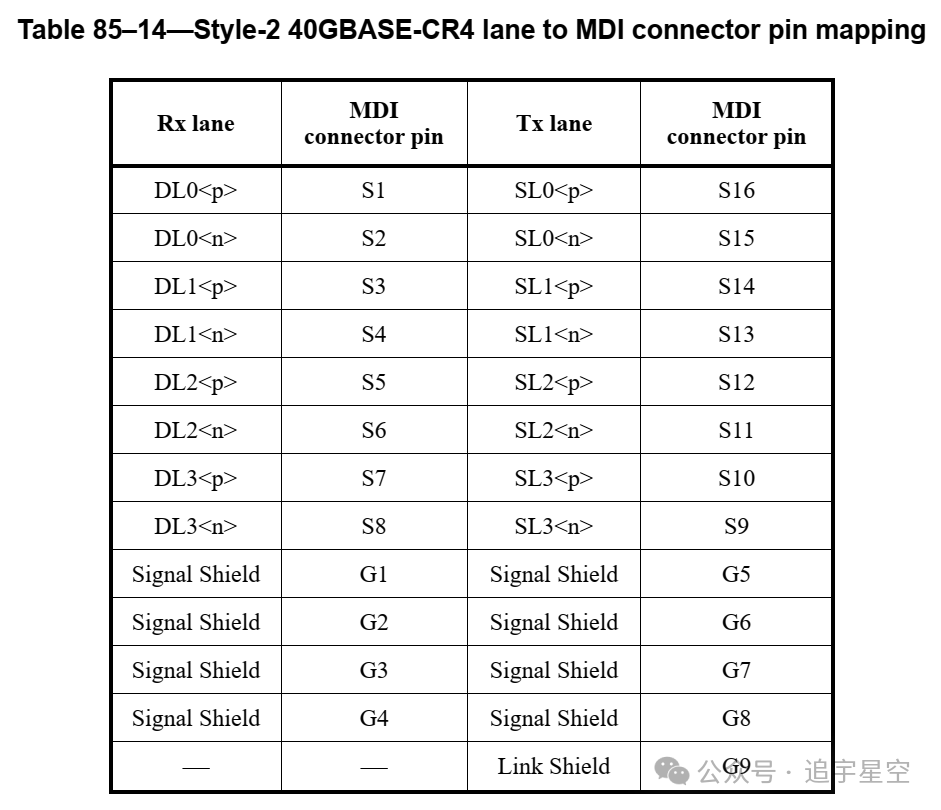 PMD的MDI连接器包括16个信号连接、8个信号屏蔽连接和1个链路屏蔽连接。40GBASE-CR4 MDI连接器引脚分配应如表85-14所示。
