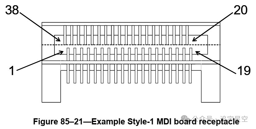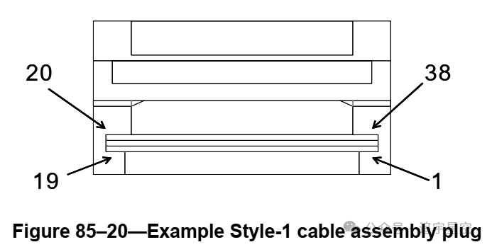 电缆组件每端的连接器应为带SFF-8470规定的机械配合接口的闩锁式插头,如图85-22所示。MDI连接器应为闩锁式插座,具有SFF-8470定义的机械配合接口,如图85-23所示。这些连接器的引脚与表85-14中的引脚匹配,电气性能符信号质量和电气要求。请注意,Style-2 40GBASE-CR4 MDI支持与10GBASE-CX4的兼容性。