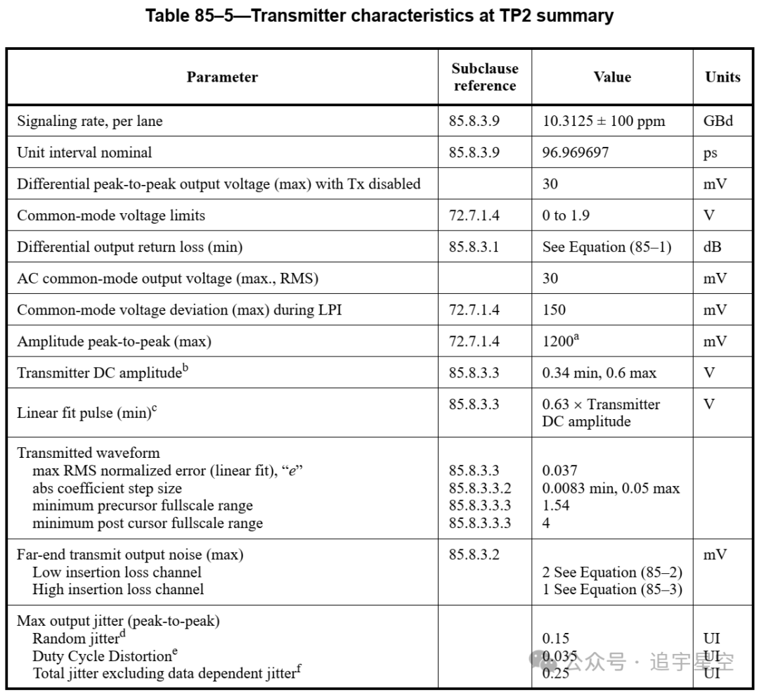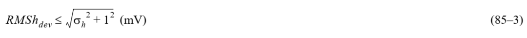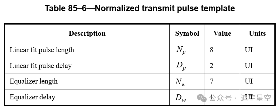 脉冲拟合和均衡滤波器的参数如表85-6所示。直流振幅,即步骤3)的线性拟合脉冲响应之和p(k)除以步骤3)中的M,应大于0.34 V且小于或等于0.6 V。步骤3)线性拟合脉冲反应的峰值应大于0.63´直流振幅。步骤3)的线性拟合与归一化为脉冲峰值p的测量波形e之间的误差均方根值不得大于0.037。