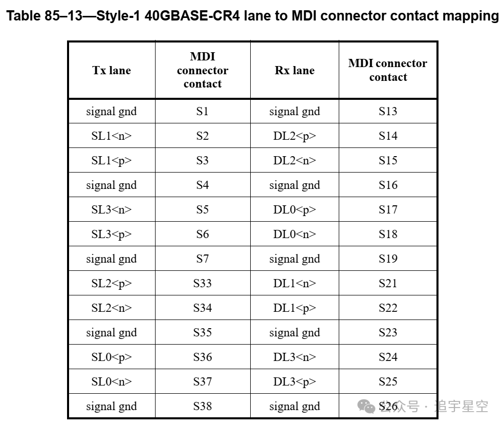 40GBASE-CR4 PMD的Style-1 MDI连接器包括38个信号连接。样式1 40GBASE-CR4 MDI连接器触点分配应如表85-13所示。
