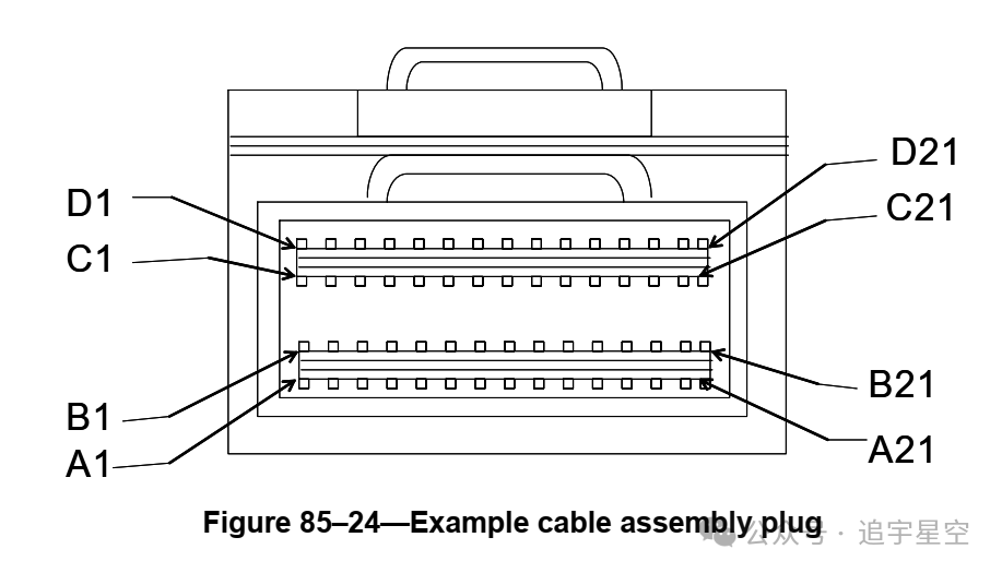 电缆组件每端的连接器应为四边形小尺寸可插拔(QSFP+),具有SFF-8436定义的机械配合接口,如图85-20所示。MDI连接器应为四小尺寸可插拔(QSFP+)插座,具有SFF-8436定义的机械配合接口,如图85-21所示。这些连接器的触点分配与表85-13中的触点分配相匹配,电气性能符合信号质量和电气要求。
