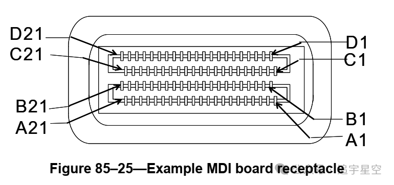 电缆组件两端的连接器应为SFF-8642中定义的带有机械配合接口的插头,如图85-24所示。MDI连接器应为具有SFF-8642定义的机械配合接口的插座,如图85-25所示。这些连接器具有触点分配与表85-15中的触点分配相匹配,电气性能符合信号质量和电气要求。