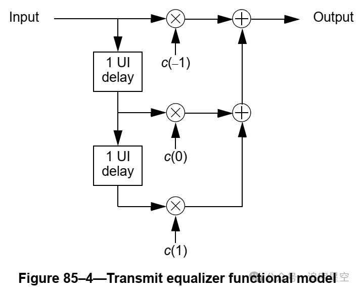 40GBASE-CR4和100GBASE-CR10发送功能包括可编程均衡,以补偿信道的频率相关损耗,并促进接收器的数据恢复。发射均衡器的功能模型是图85-4所示的3抽头横向滤波器。