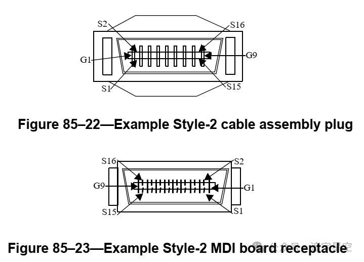 应使用符合样式-1或样式-2要求的连接器作为PMD和电缆组件之间的机械接口。插头连接器应用于电缆组件和PHY上的插座。样式-1或样式-2连接器可用作MDI接口。