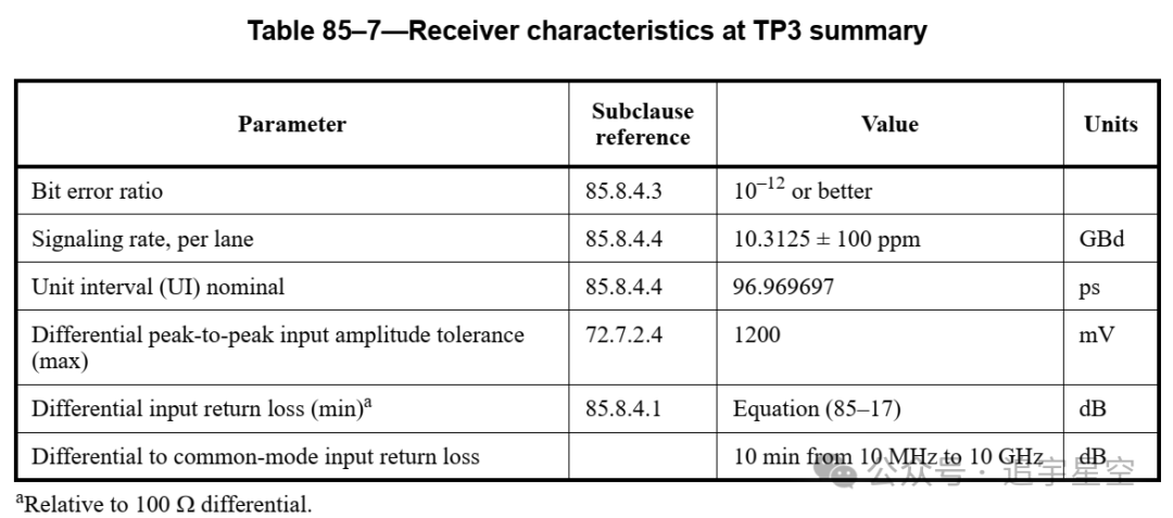 除非另有说明,否则接收器特性应符合TP3表85-7中总结的规范。
