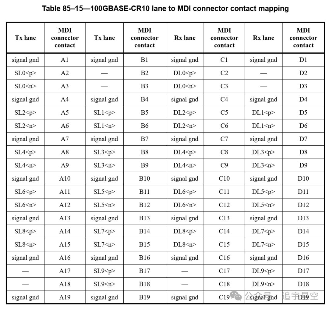对于100GBASE-CR10,每个方向有10个差分路径,总共20对,即40个连接。信号路径旨在在长度为0.5m至7m的双轴电缆组件上运行。