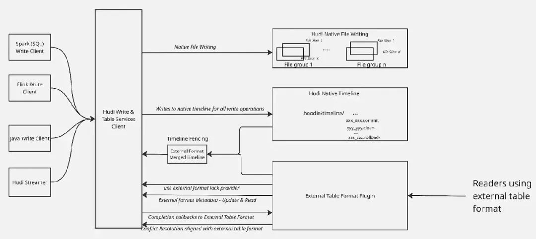 我已经提出了一个PR[9](我希望它会进入即将发布的Hudi 1.1版本),向Hudi引入新的可插拔表格式接口。这个RFC的核心是TableFormat接口,它抽象了通常只在Hudi的本机格式上执行的元数据和时间线操作(即当前使用的格式)。这个接口有关键的回调和接口,用于将插件与Apache Hudi写入器集成。