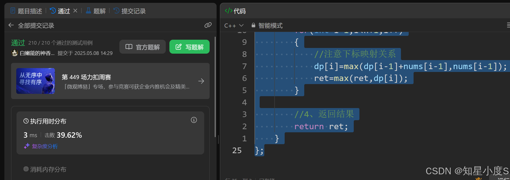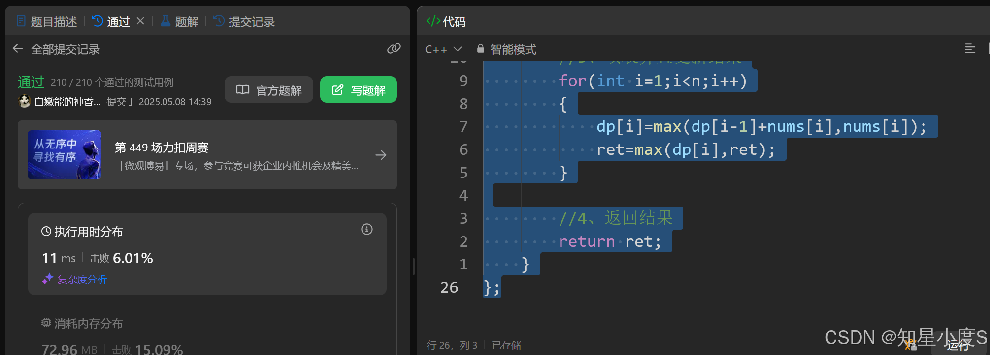 我们以离【i】位置最近的状态分析状态转移方程,处理dp表 既然状态表示为: 以【i】位置为结尾最大子数组和~ ,那么第i个位置肯定在子数组中,那么以【i】位置为结尾的最大子数组和长度可能为1,那么就是它本身;以【i】位置为结尾为结尾的最大子数组和长度可能大于1,那么以【i】位置为结尾的最大子数组和就等于以【i-1】位置为结尾的最大子数组和+nums【i】~取两种情况最大值就可以了~