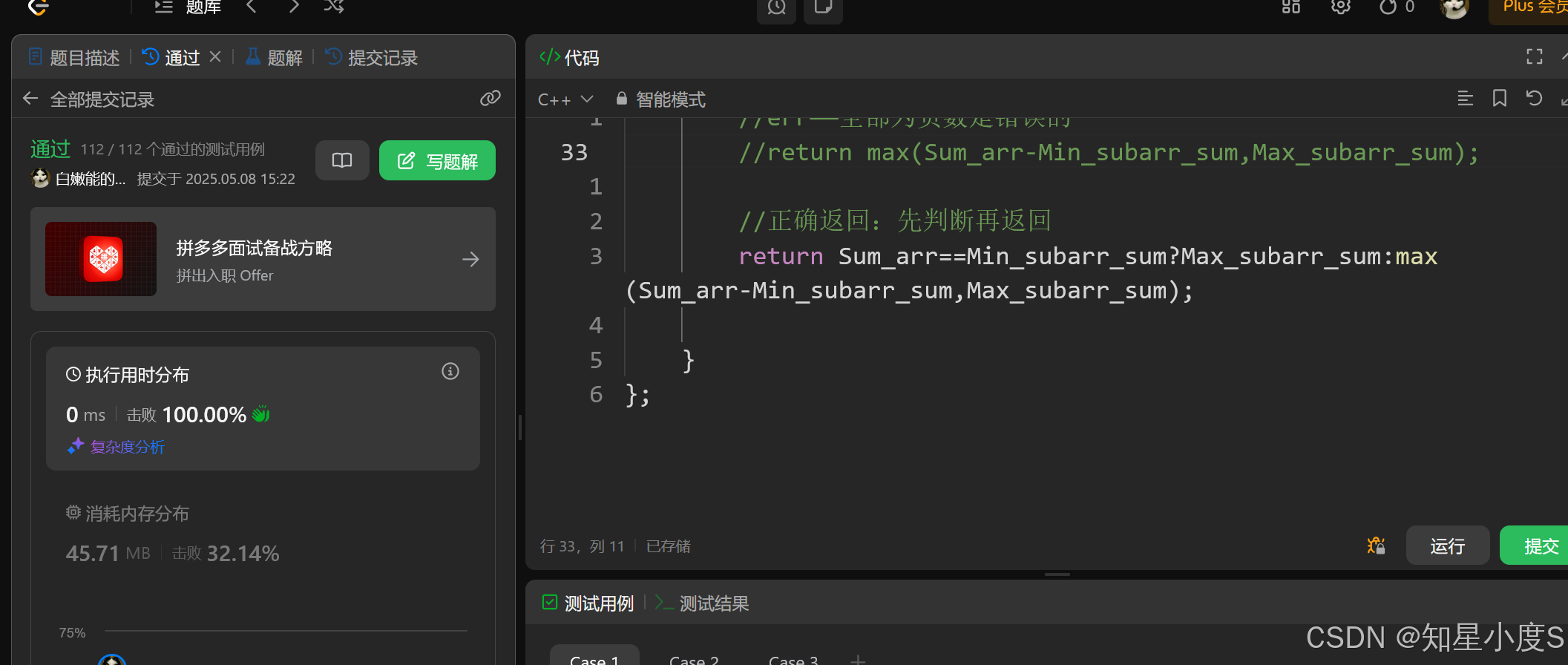 这里返回结果是到最大子数组和,最大子数组可能是情况1,也可能是情况2,情况1的最大子数组和是dp1表中最大值;情况2的最大子数组和是整个数组和减去最小子数组和~ 返回两种情况的最大值~ 注意:如果整个数组全部是负数,情况2计算结果为0,情况1计算结果为最大的负数,题目要求子数组至少包含一个元素,所以情况1的计算结果才是正确的,进行结果返回的时候需要先判断再返回~