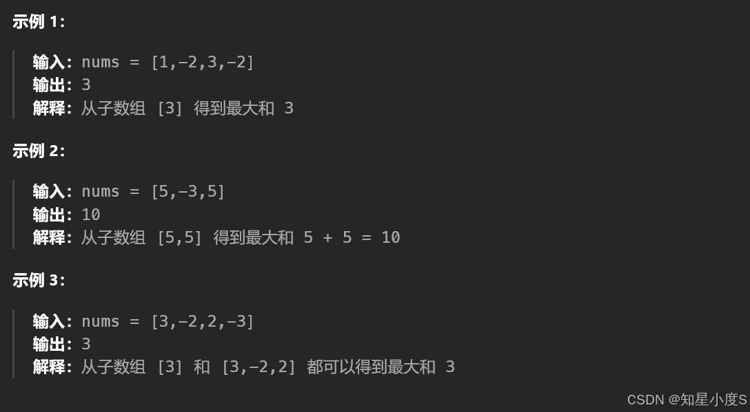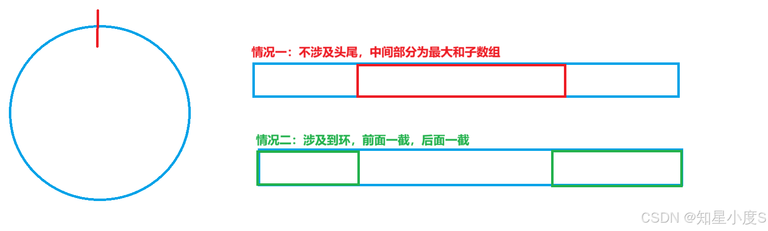 读题其实可以发现他与前面的题目十分类似,只不过这一道题目是环形数组,那么把它看成一个线性数组最大子数组和下面两种情况~