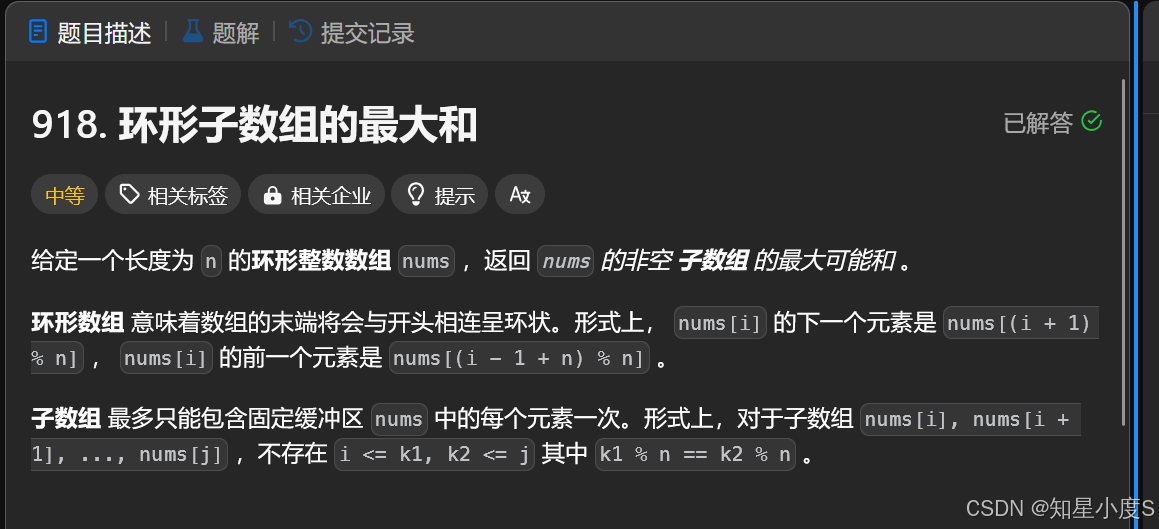 第一种情况,我们就可以使用第一个题目的思路解决,那么如果子数组和最大是第二种情况呢?分析一下:既然是头尾是最大子数组和,那么中间就是最小子数组和,用整个数组和减去最小子数组和就是我们想要的结果~那么最小子数组和我们使用动态规划思想解决~
