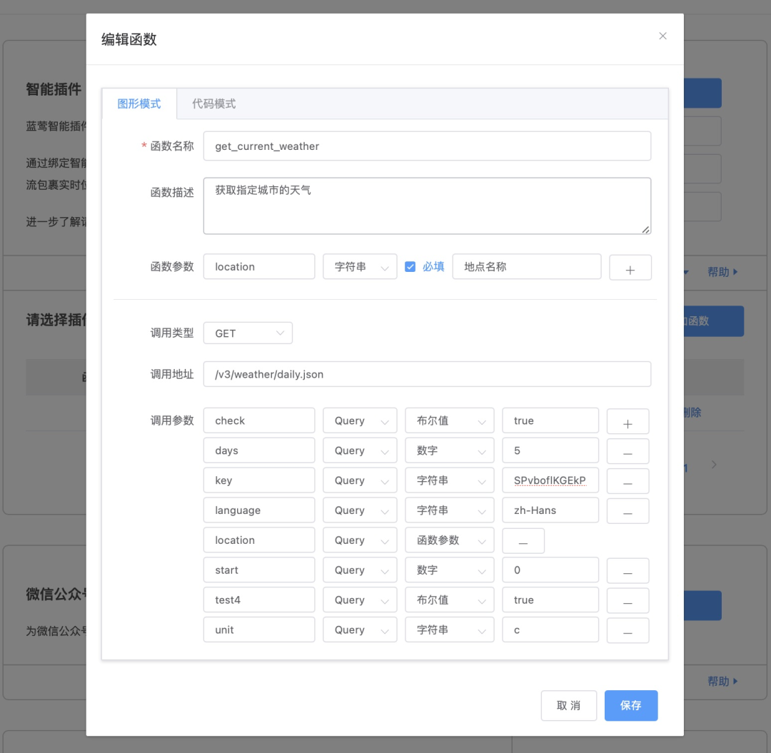 我们定义插件中的函数,就是通过定义,让大模型知道如何组装调用参数,同时定义最终调用的方法,比如使用GET或POST方法,比如增加鉴权Header等。
