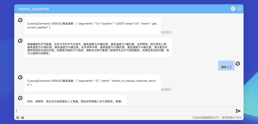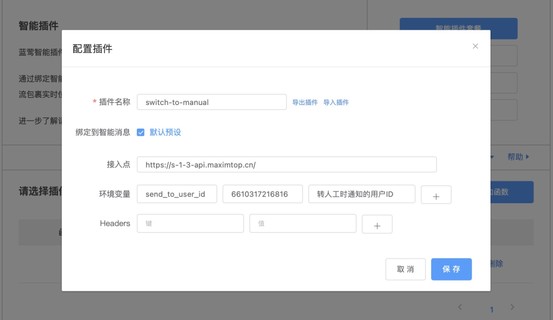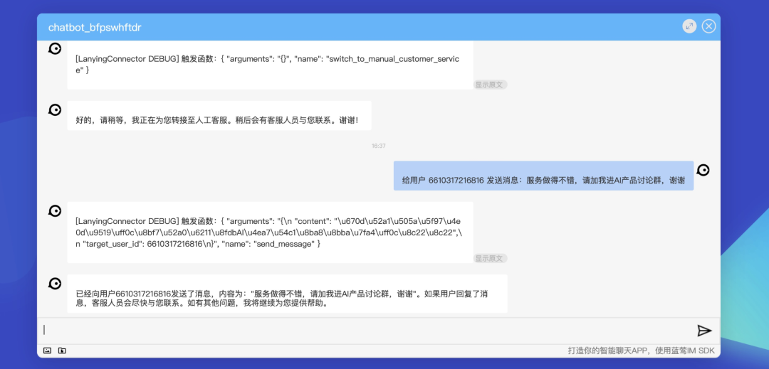 插件说明:用户在聊天时请求转人工时,发送消息给指定的蓝莺IM用户/客服坐席。