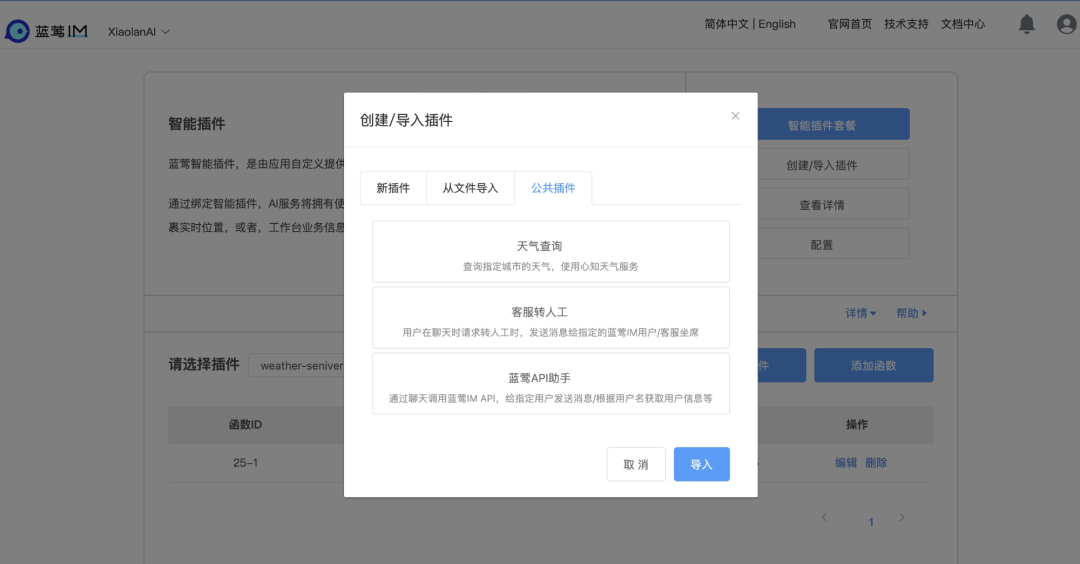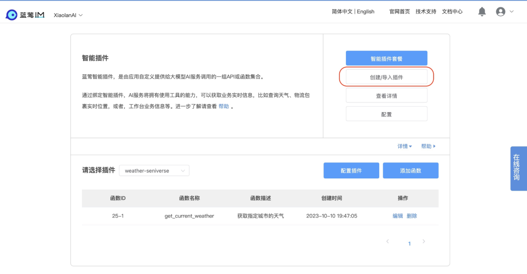 后台开通蓝莺智能插件服务,就可以创建新插件: