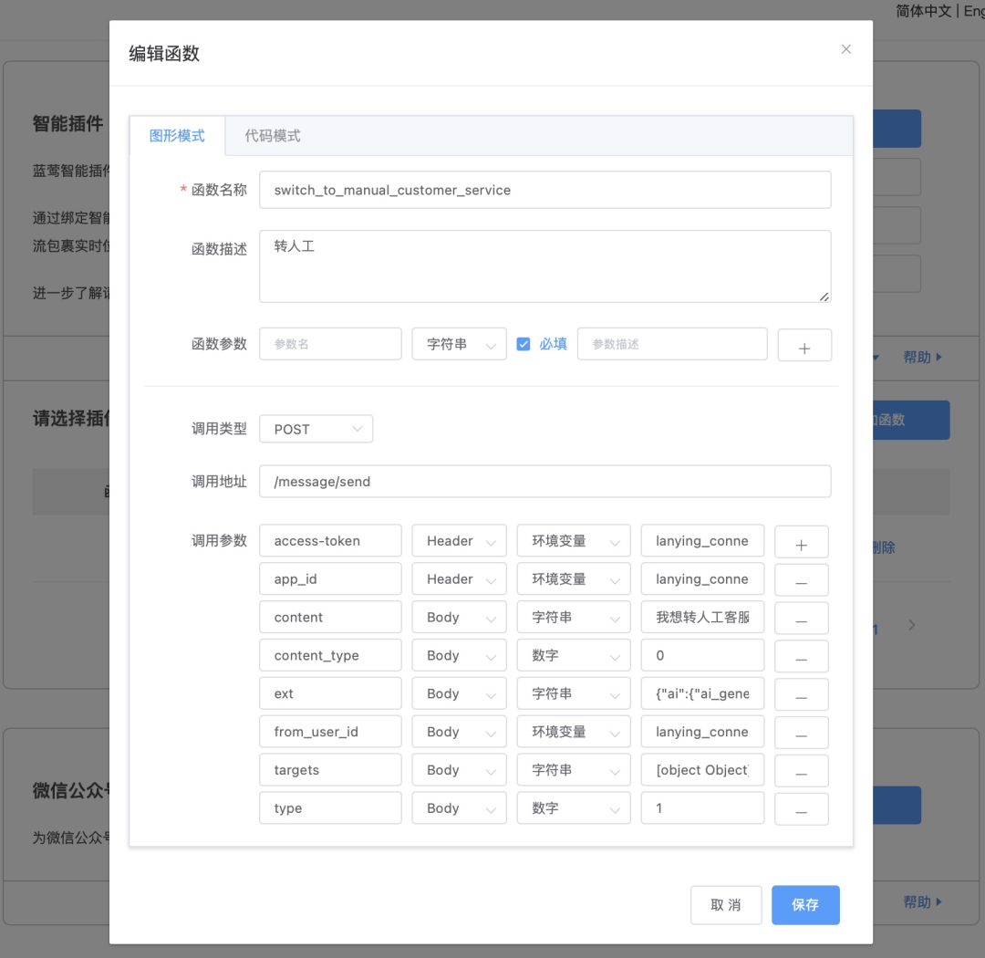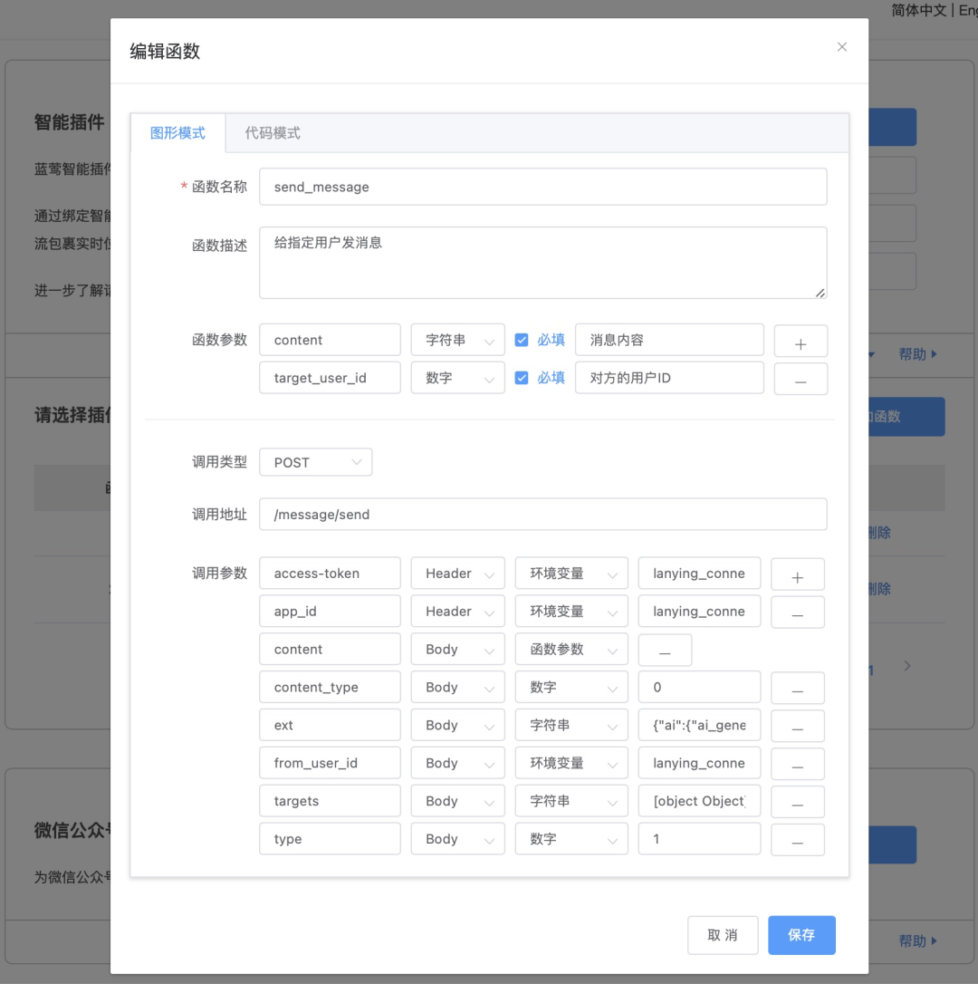 二是定义调用格式告诉插件引擎,在收到组装好的函数调用后,如何调用实际服务。在这个过程中,则会根据函数配置,将AI组装的函数参数用在调用的各个位置,比如QueryString、Header或者POST请求体Body中。