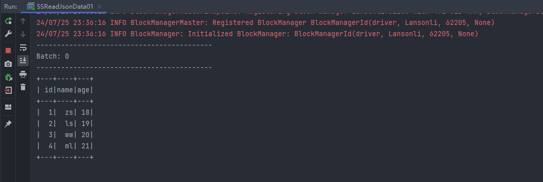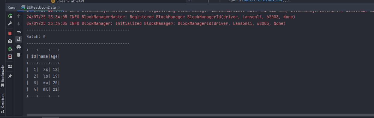 {"id":4,"name":"ml","age":21}注意:实时监控json格式数据时,创建的Schema 中的字段需要与Json中的属性保持一致,否则在映射成表时,Schema中含有但在Json中没有的属性的字段对应的数据会为null。