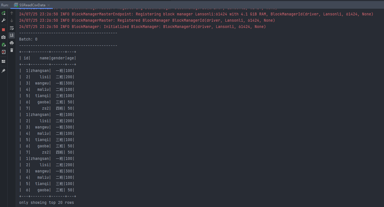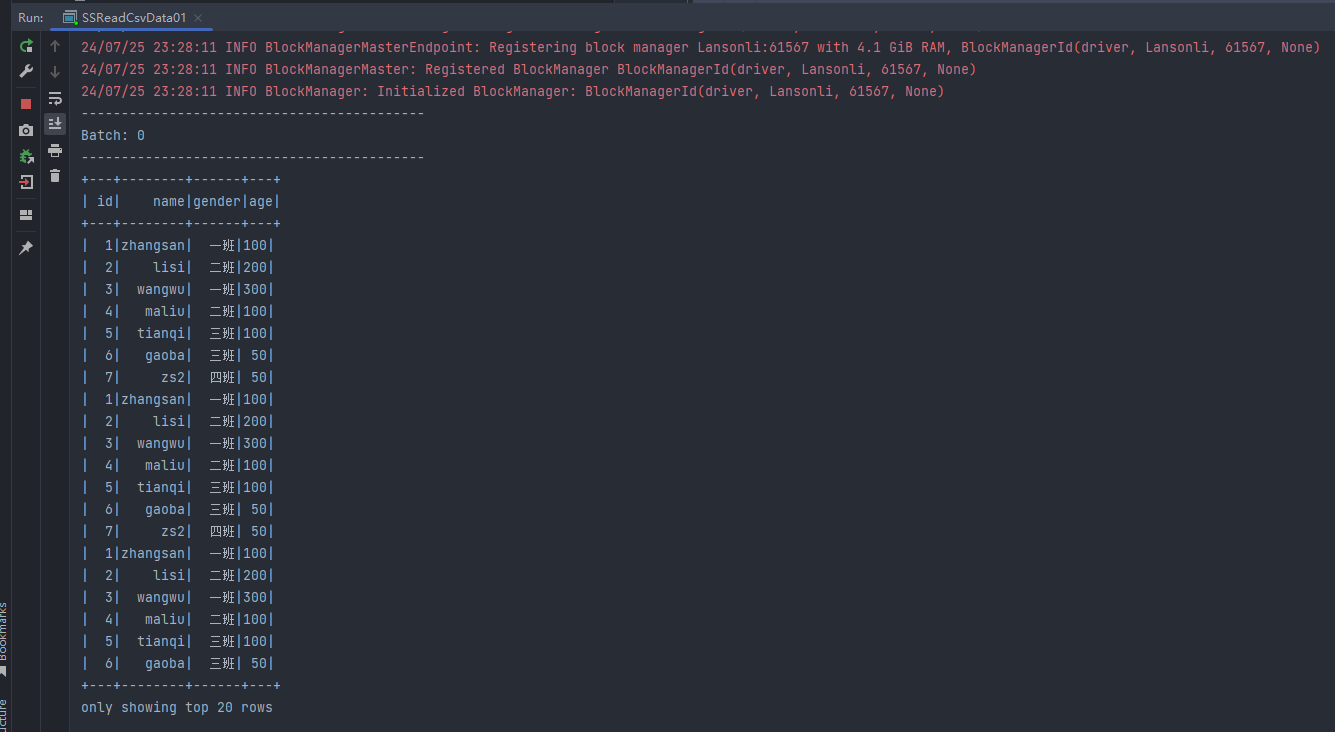 以上代码运行之后向对应监控的目录下原子性写入含有数据的csv文件,在控制台可以看到实时监控内容。文件内容如下: