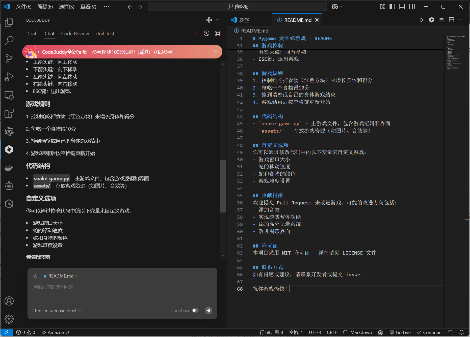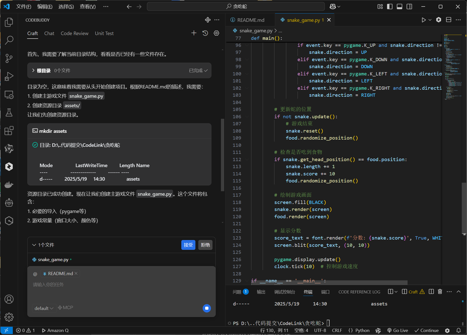 Codebuddy 最戳我的就是它超快的代码生成速度。就拿贪吃蛇游戏来说,要是自己从零开始敲代码,光是搭个基础框架,就得吭哧吭哧写好一会儿,还不一定能写得顺。但在 Codebuddy 里,只要我用大白话输入需求,比如 “搞个 Pygame 的贪吃蛇游戏窗口”,它唰地一下就能给我甩出一段能用的代码。这效率,直接把摸鱼开发的时间成本砍了一大半,四舍五入就是多摸了半小时鱼啊!