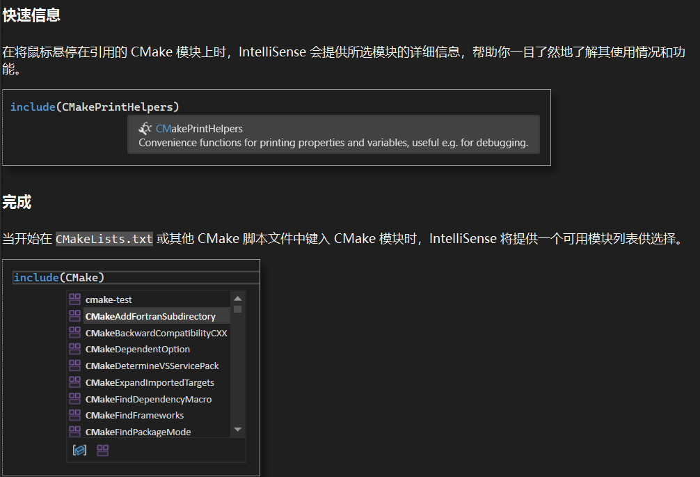 已在 Visual Studio 中为 CMake 模块添加了基于 IntelliSense 的完成和快速信息支持。 现在可以直接从 Visual Studio 编辑器中查看所有可用的 CMake 模块并了解更多相关信息,从而使开发过程更顺畅、更高效。