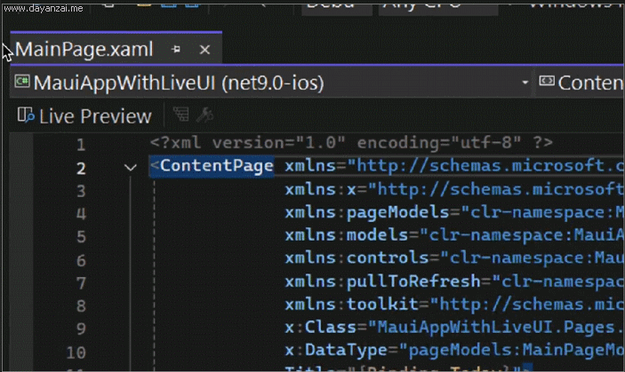 单击新的实时预览指示器,在设计时从任何 XAML 文件访问实时预览: