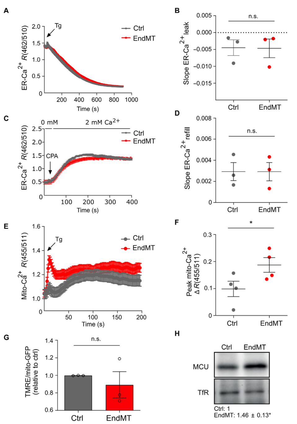 图5E-F:Tg刺激后,EndMT细胞线粒体钙摄取峰值显著升高,说明线粒体功能增强。