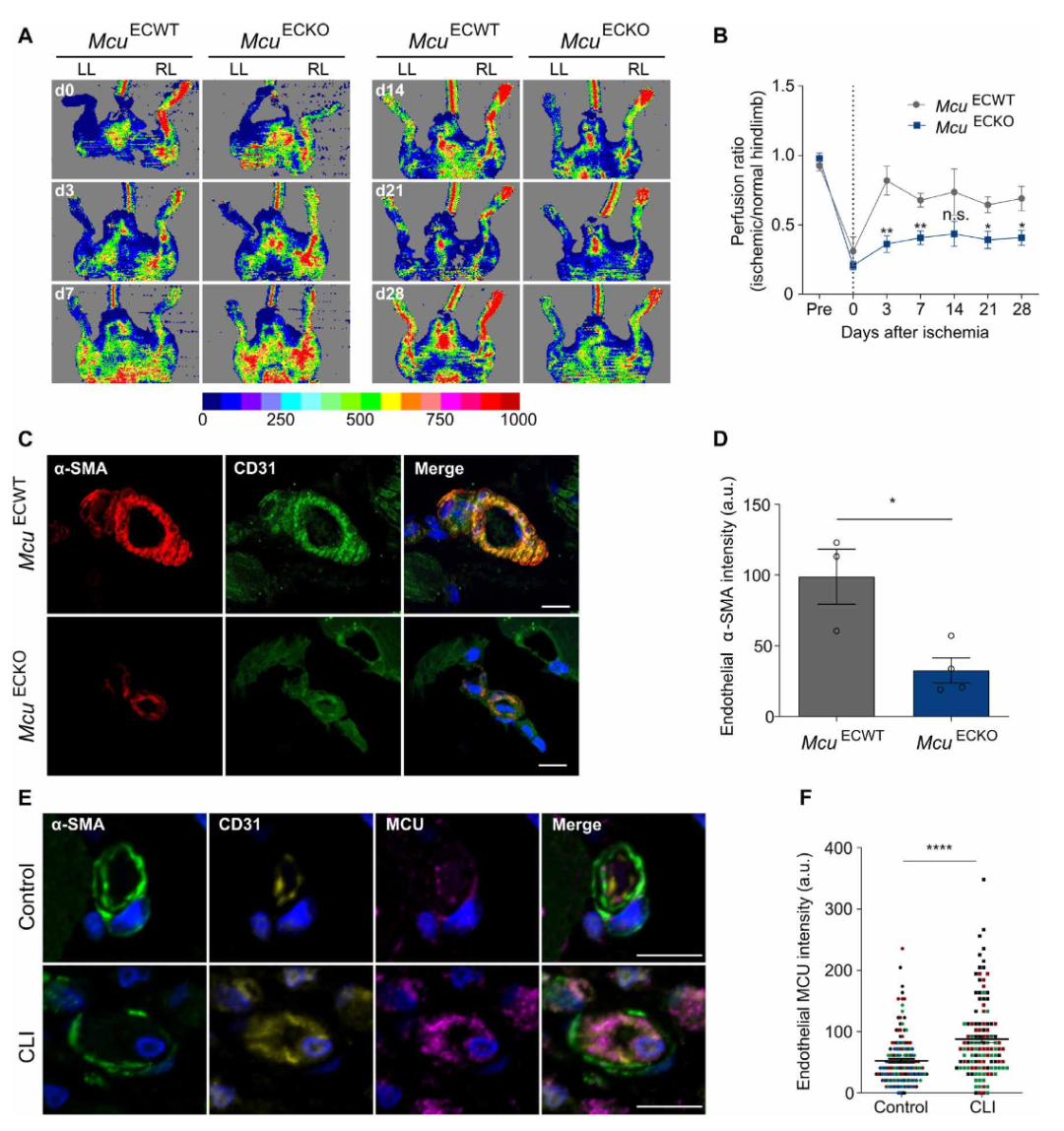 图8E-F:人CLI(慢性肢体缺血)肌肉中,血管内皮MCU表达显著升高。