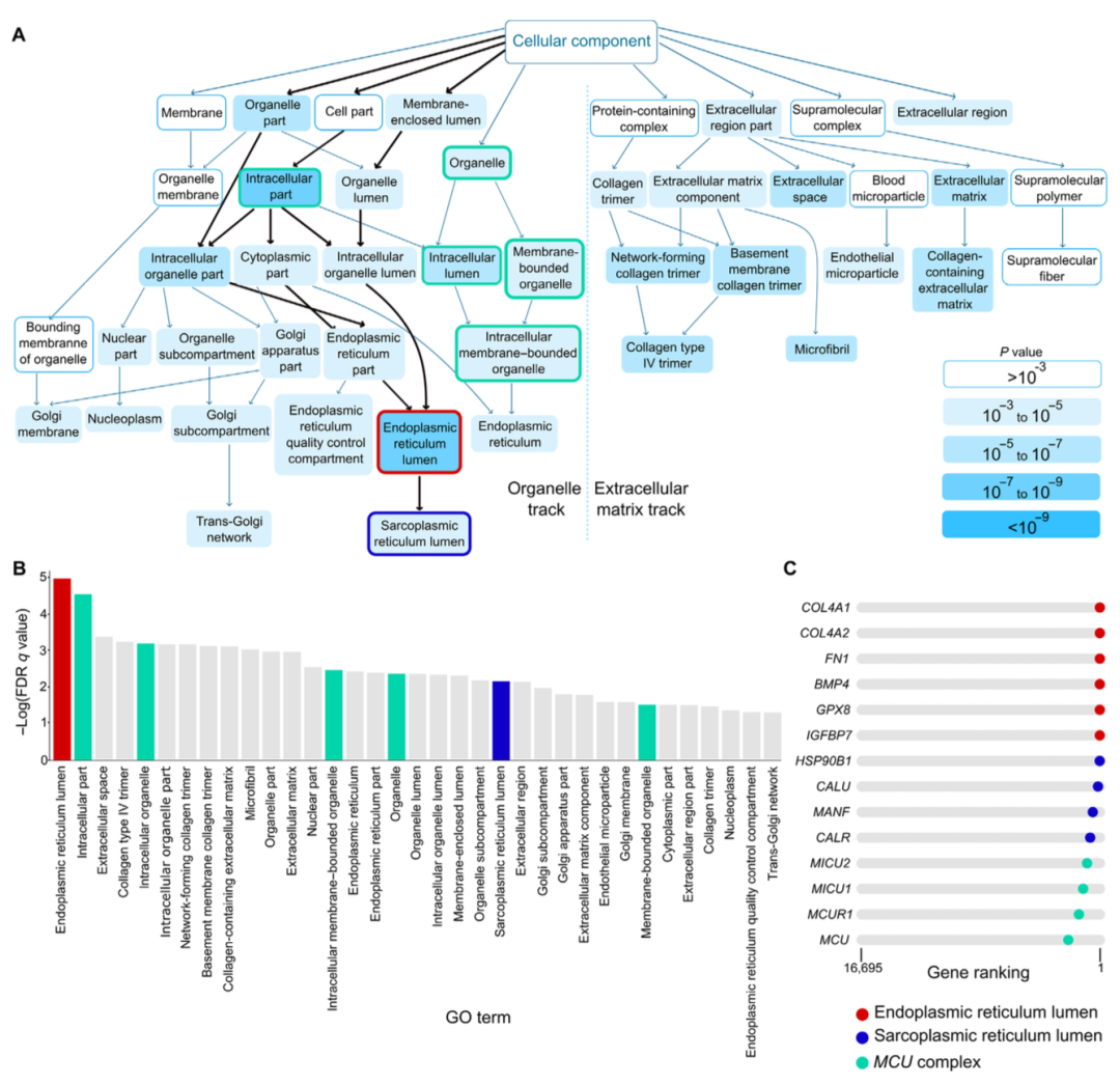 ECM结构形成通路上调;MCU复合物成员的条目被绿色标出。图4C:String图中,ER lumen、SR lumen和MCU复合物基因排名靠前。
