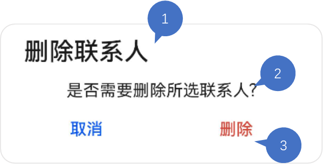 如下图中的“删除联系人”弹框,一个AlertDialog包含标题、内容和操作区三个部分组成,操作区包含两个按钮,我们可以在按钮的点击事件里添加对应响应逻辑。