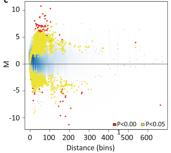 最后,可以使用 topDirs 函数提取并保存结果,指定对数变化倍数的阈值(logfc_cutoff 参数)、对数每百万计数(logcpm_cutoff 参数)、校正后的 p 值(p.adj_cutoff 参数),以及结果的格式(bed 或 pairedbed 格式;后者适用于在 JuiceBox 中进行可视化)。