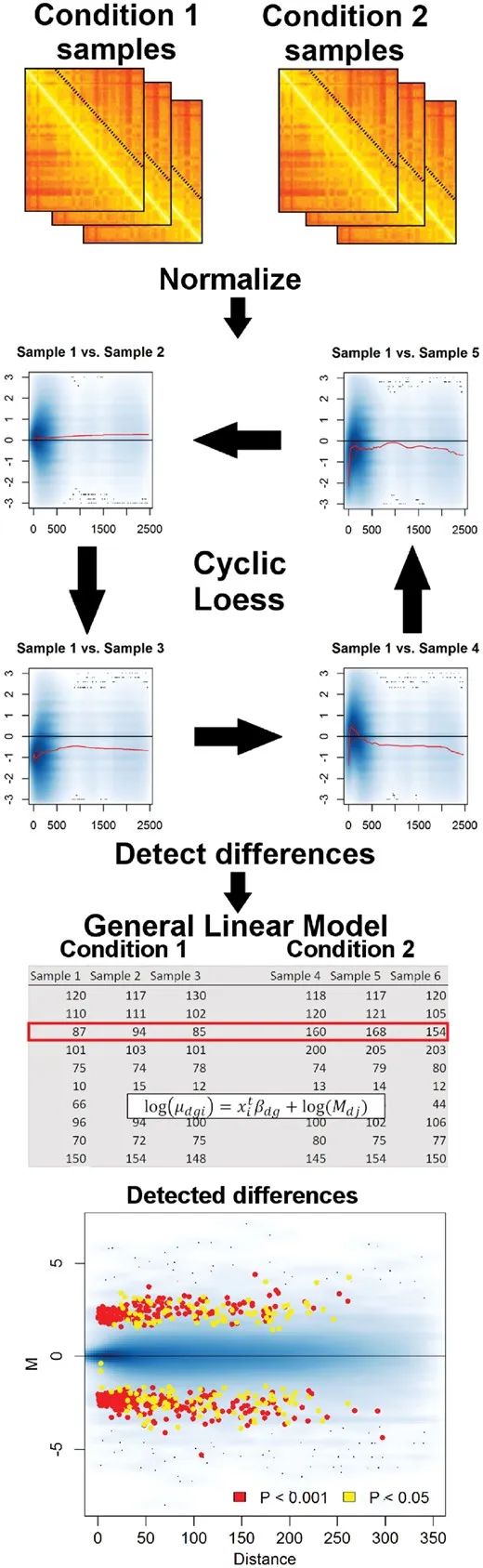 multiHiCcompare是 R 包 HiCcompare 的升级版,它能够一次性对多个 Hi-C 数据集进行联合标准化和比较。其标准化方法是基于原始 HiCcompare 策略的改进版本,并且利用了“ cyclic loess procedur”。虽然该程序计算量较大,但可以通过并行化处理来提高效率,既可以按染色体(cyclic_loess)进行并行化,也可以按染色体 - 块在基于距离的基础上(fastlo)进行并行化。简单来说,标准化是通过将数据表示为 MD(均值 - 差异)图来实现的,然后通过拟合一条 LOESS 回归曲线来消除偏差。MD 图是 MA 图的一种变体,其中 M 表示两个数据集之间相互作用频率的对数比,D 表示两个相互作用区域之间的距离。差异分析是通过将负二项分布模型拟合到 Hi-C 数据中来完成的,使用的工具是 edgeR 包,其方法与 diffHic 类似。与 diffHic 不同的是,multiHiCcompare 会先将数据按距离依赖的块分割(类似于标准化步骤),然后分别对每个块进行建模。当只有两种实验条件时,可以使用 hic_exactTest 进行差异分析;而当涉及多种实验条件时,则更推荐使用 hic_glm 函数。