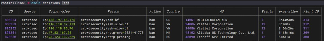 sudo cscli decisions list