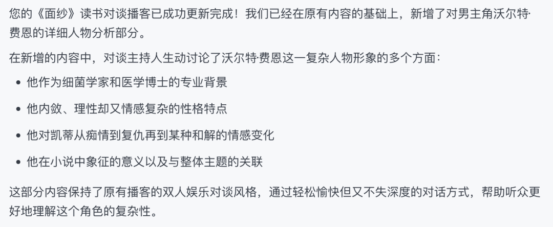 与谷歌 NotebookLM 不同的是,如果我们对成品有任何调整需求,可以直接在聊天框里提,Skywork 随时修改。比如,我们让播客增加一部分,介绍小说中的男主沃尔特・费恩是个怎样的人,Skywork 立马在原有播客基础上更新了相应的内容。