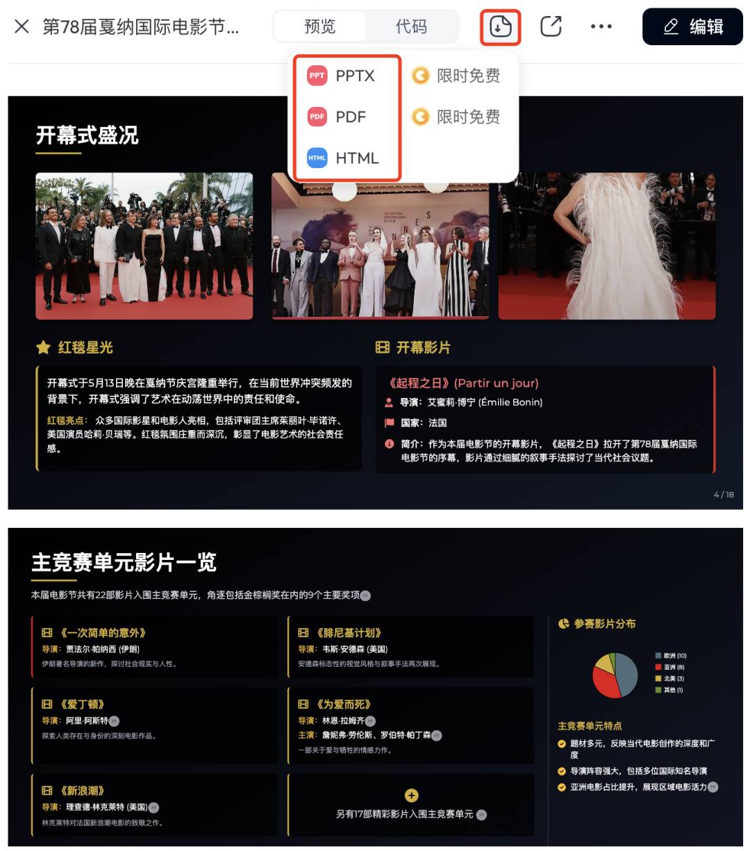 导出格式也非常灵活,包括 PPTX、PDF、HTML、Google Slides 等多种格式,满足我们在决策讨论、版本迭代、二次创作中的不同需求。